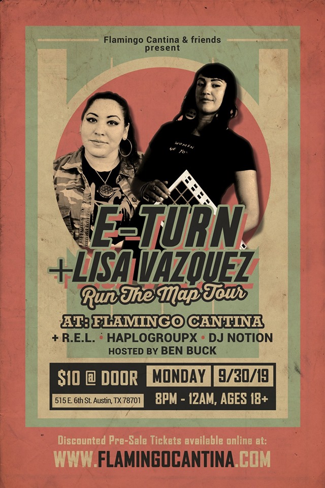 Come out for a night of organic Beats & Rhymes starring E-Turn + Lisa Vazquez “Run The Map” at the legendary Flamingo Cantina Monday September 30 along with some Texas’ heavy hitters!