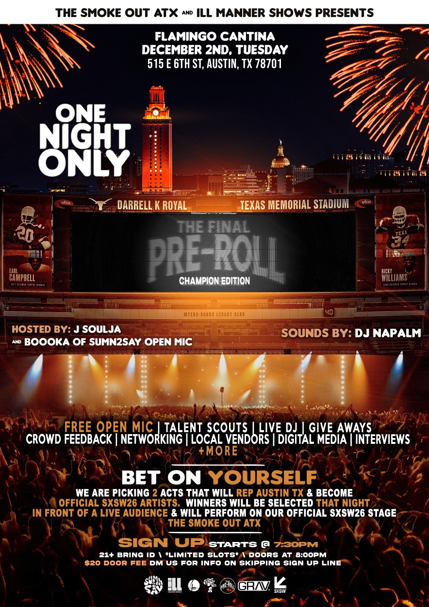 This is the last and final Pre-Roll ATX open mic night—in other words, your last chance to bet on yourself and network, perform in front of talent scouts, get crowd feedback, and maybe score a spot on The Smoke Out ATX official SWSX 2026 stage! Plus local vendors, giveaways, interviews, and more!