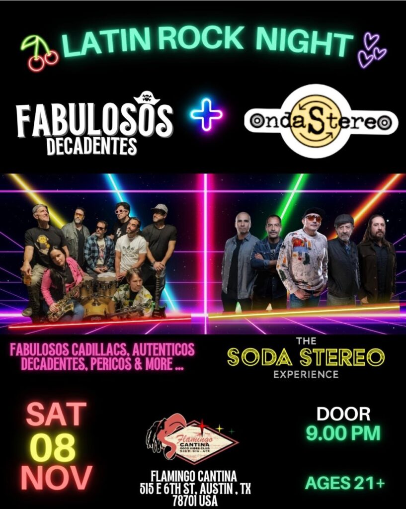 Fabulosos Decadentes is an unforgettable experience that brings the soul of Argentine rock straight from Houston, TX! Since 2023, their shows are a lively carnival of music and fun, a celebration packed with energy. With a repertoire of classics from Los Fabulosos Cadillacs, Los Auténticos Decadentes, Los Pericos, Andres Calamaro, La Mosca, and more.