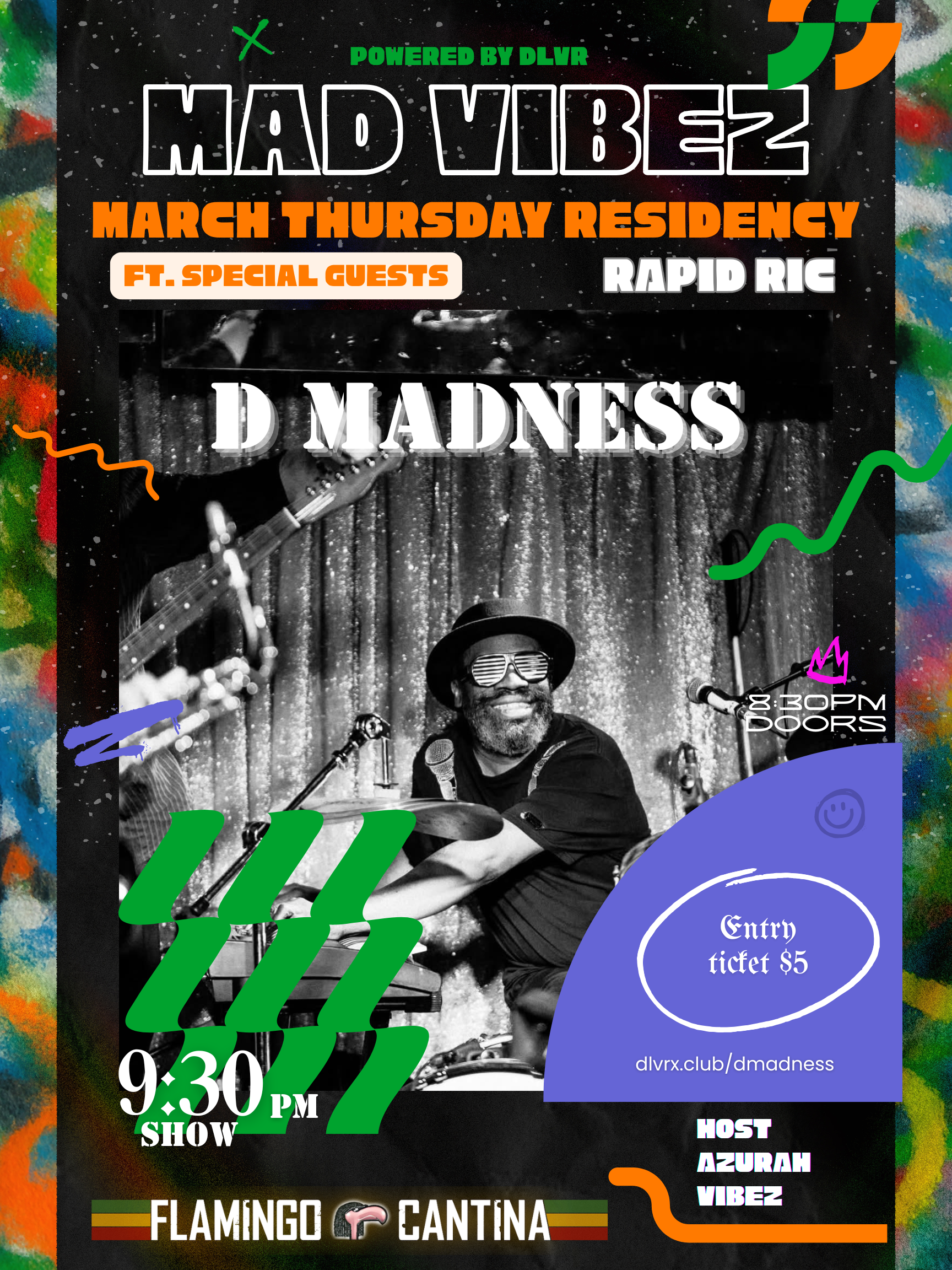 Welcome to Mad Vibez with DMadness & Rapid Ric Thursday March Residency at Flamingo Cantina! Get ready to experience a night of pure madness and music. Join us for an unforgettable event filled with incredible beats and good vibes as DMadness & Rapid Ric take over the Flam Can on Thursday nights! DMadness is an unsung gem of the corenerstone of Austin’s Vibrant music scene, has helped the city earn the title of Live Music Capital. The multi-talented musician plays various instruments in multiple bands and fronts his own one man project, writing, producing, singing, and playing several instruments simultaneously. If yiou ask anyone who’s ever seen or heard D-Madness: It’s a one of a kind experience you have to witness for yourself! Don’t miss out on this opportunity to dance the night away with friends and fellow music lovers. Hosted by Azurah Vibez.