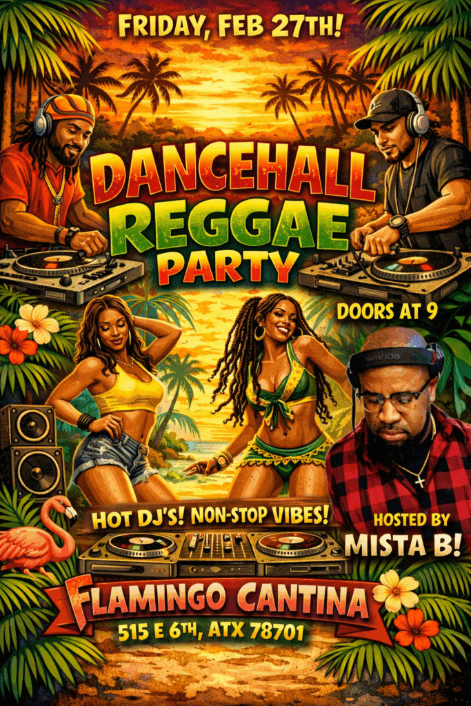 Get ready to get your groove on at Flamingo Cantina on Saturday, February 27th! 🎶 Dust off your dancing shoes and join us for a night filled with fun party music including your favorite Dancehall & Reggae bangers all night. Musical Niceness by Mista B + more! Don’t miss out on this dance party that will have you grooving with the vibes. See you there!
