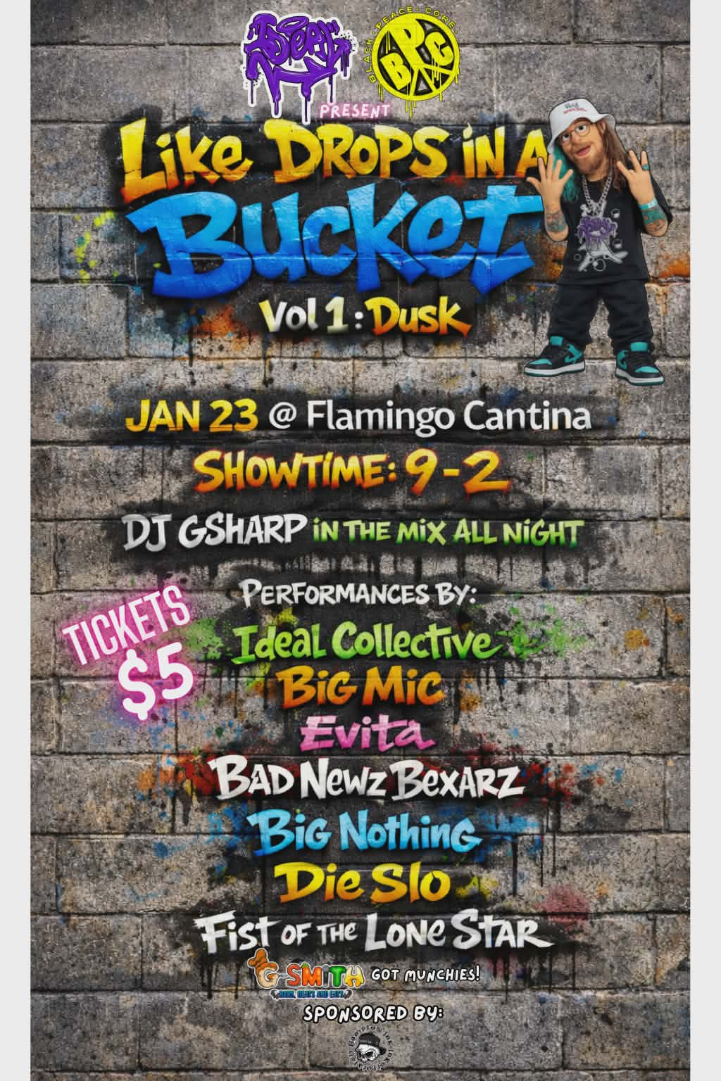 Ideal Collective presents Like Drops in a Bucket Vol 1 Dusk pre release show featuring CHHK alumni Big Mic and Evita both doing solo sets, The Legendary Die Slo crew, ATX sensation Big Nothing, The Dynamic duo from San Antonio Bad News Bexars, The Lyrical Assassin’s Fist of the Lone Stars and Performing tracks of his upcoming album Salus Herb and the rest of Ideal Collective crew. Dj GSharp in the mix all night!