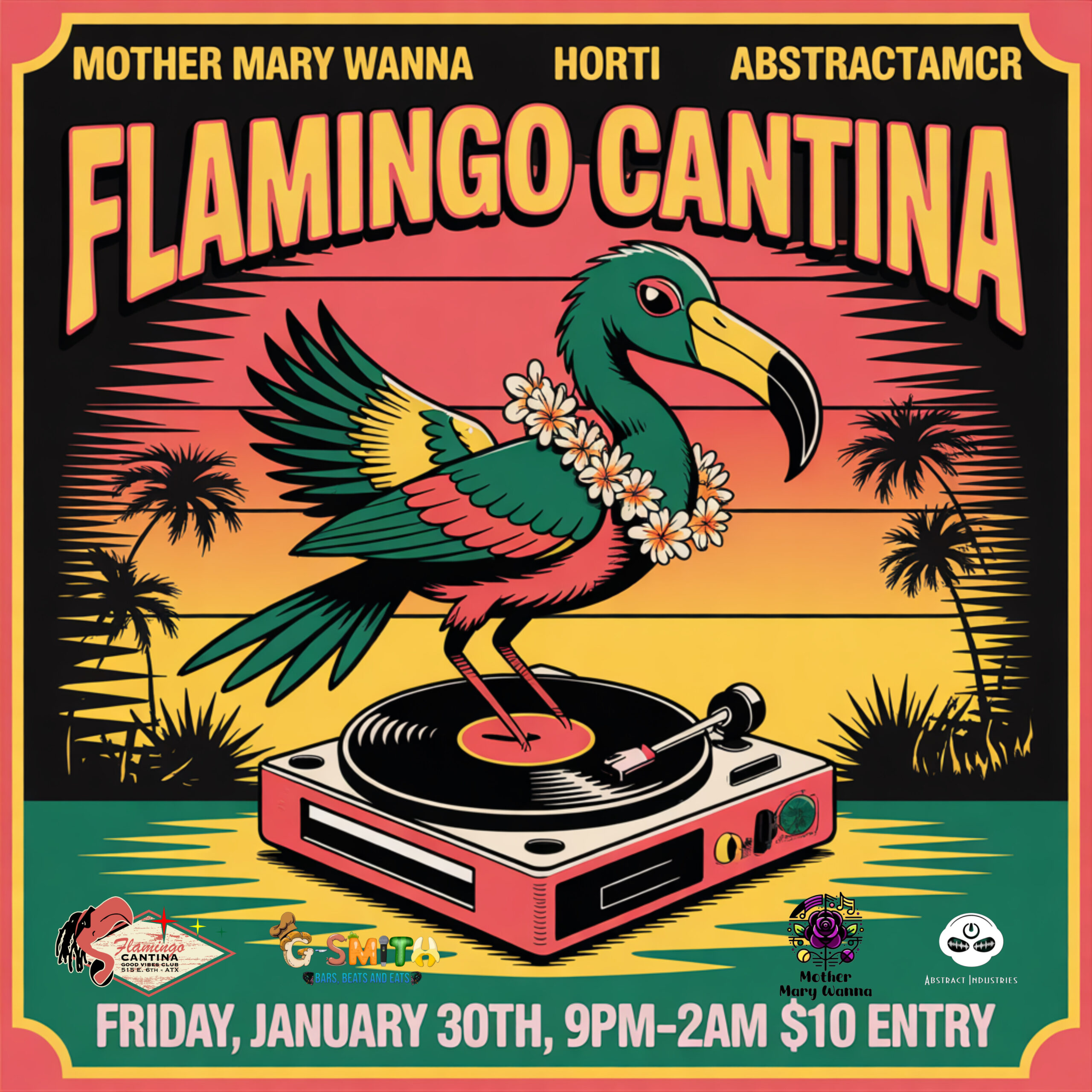 Join us at the legendary Flamingo Cantina for a fun night of Reggae, Soul, Funk and all the good vibes you can handle with live nusic by Reggae Funk Songstress Mother Mary Wanna band, a live set by Horti (Whiskey Shivers+SIPA), and AbstractAMCR in the mix all night!
