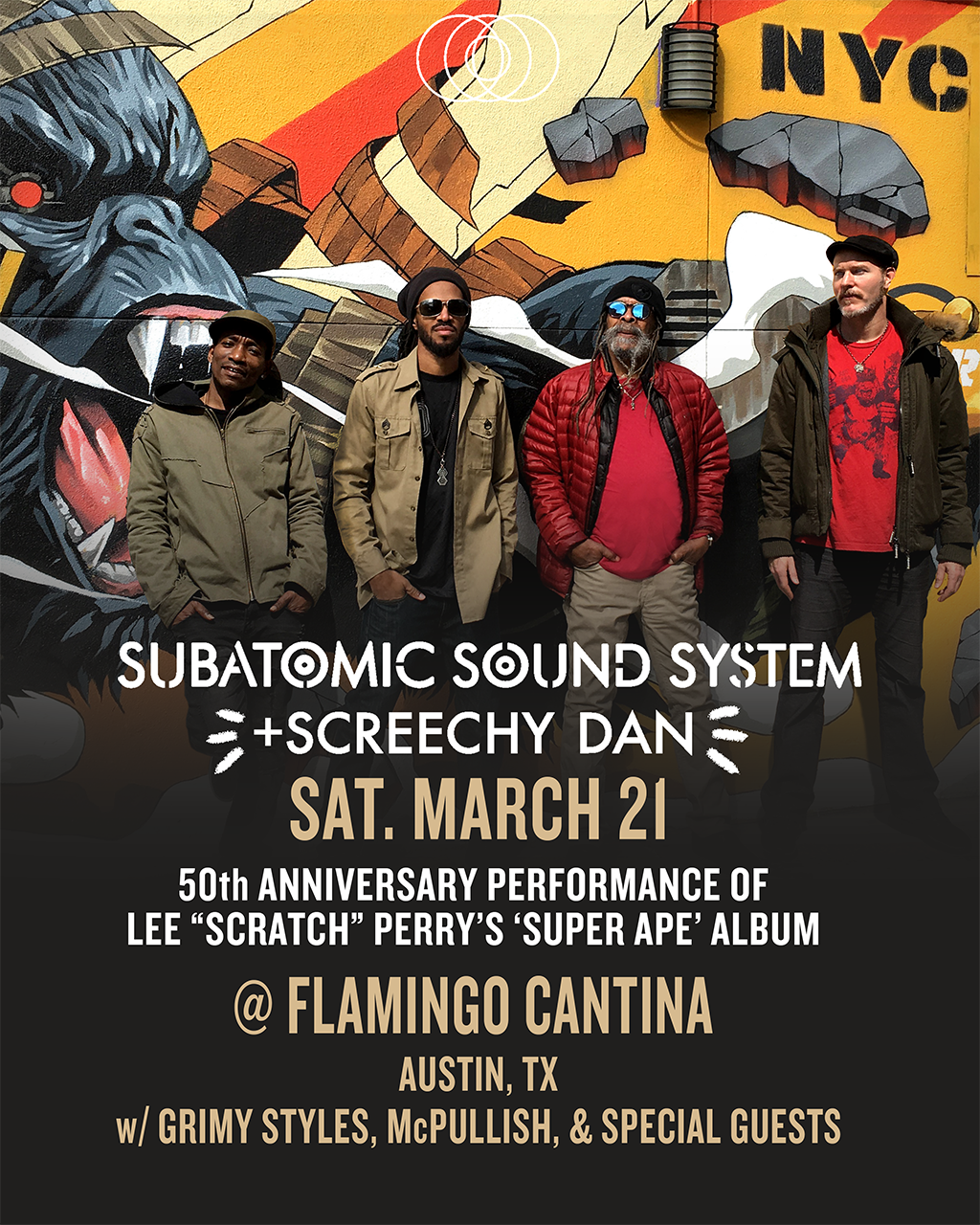 Join us on March 21, 2026 at 9:00 PM as Subatomic Sound System and Screechy Dan pay tribute to the iconic Lee “Scratch” Perry for his 90th birthday plus 10 year anniversary of the Super Ape Returns to Conquer project. Expect deep roots, heavy bass, and a whole lot of fun. Don’t miss out on this epic celebration of dub and reggae culture! Featuring support from Grimy Styles, McPullish & special guests!